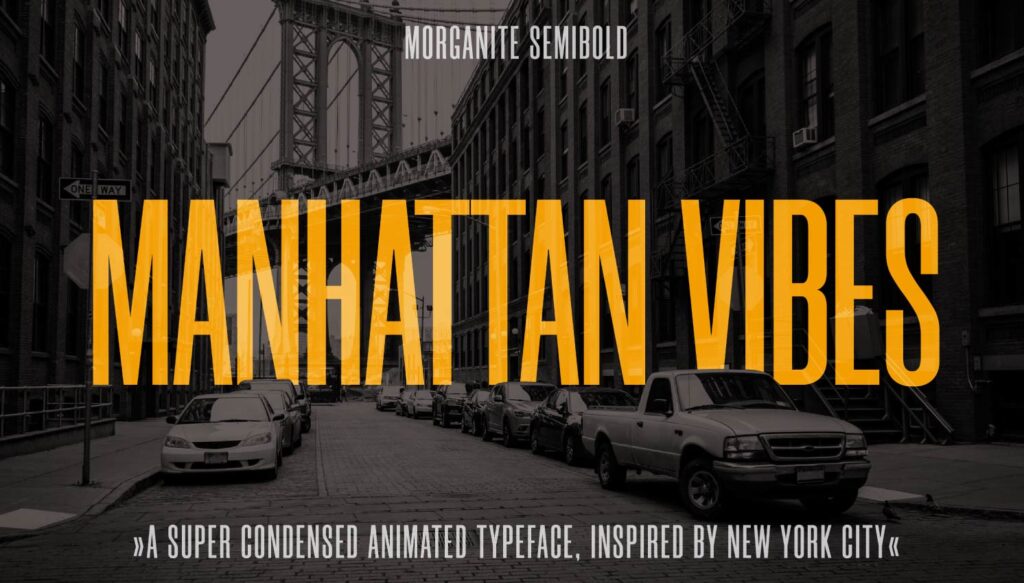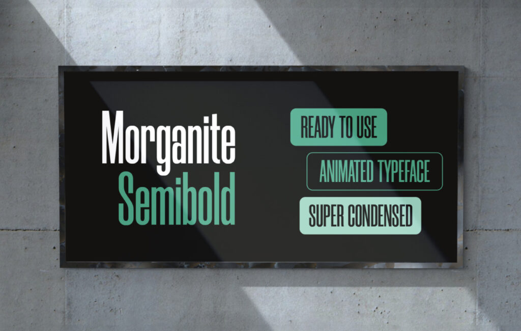 Morganite è un font condensed dal forte impatto visivo e dall'ottima leggibilità. Il suo stile urban lo rende perfetto per branding, poster e titoli. La versione animata scelta per questo progetto è il Semibold, ma è possibile sperimentare anche con tutte le altre versioni statiche (da thin a black).